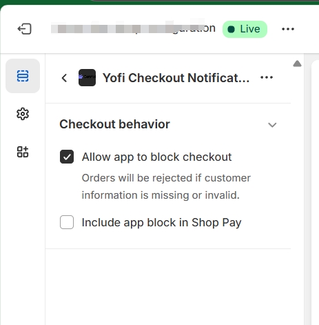 After adding the Yofi Checkout Notification, select it from the left panel, then enable Allow App to Block Checkout under Checkout Behavior.