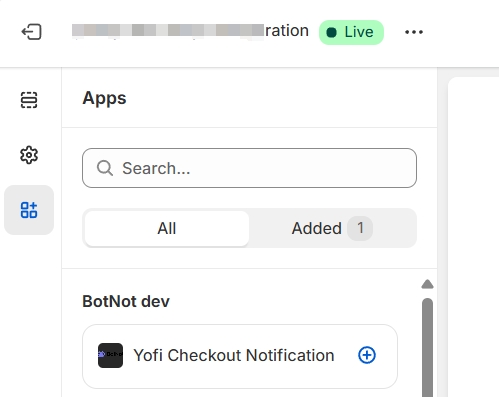 If you don’t see Yofi Checkout Notification, click View all apps and locate it. Then, click the Plus icon to add it.