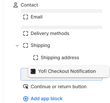 Please note that the Yofi Checkout Notification may not appear in the checkout page editor preview for certain Shopify templates (themes). This is not a concern, as the feature remains functional. You can test it by creating a rule with a simple condition (e.g., "email domain contains example.com") and verifying it on the live checkout page by placing an order using an email address ending with example.com.